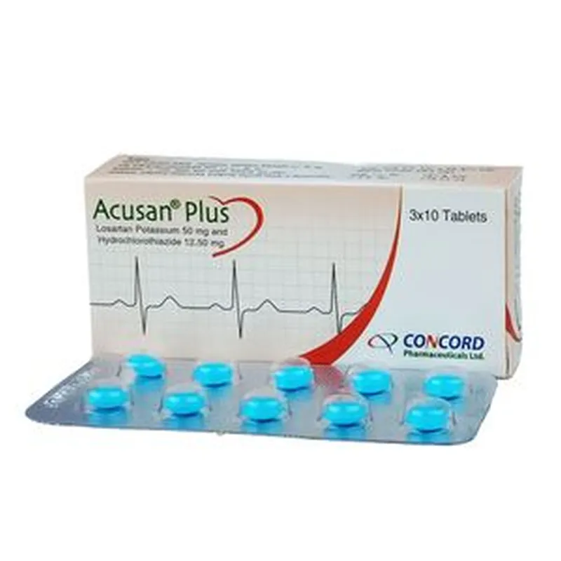 How Acusan Plus 50 works: Acusan Plus 50 is a combination of two medicines: Losartan and Hydrochlorothiazide, which lowers the blood pressure effectively. Losartan is an angiotensin receptor blocker (ARB). It works by blocking the hormone angiotensin thereby relaxing blood vessels. This allows the blood to flow more smoothly and the heart to pump more efficiently. Hydrochlorothiazide is a diuretic that removes extra water and certain electrolytes from the body. Over time it also relaxes blood vessels and improves blood flow.